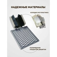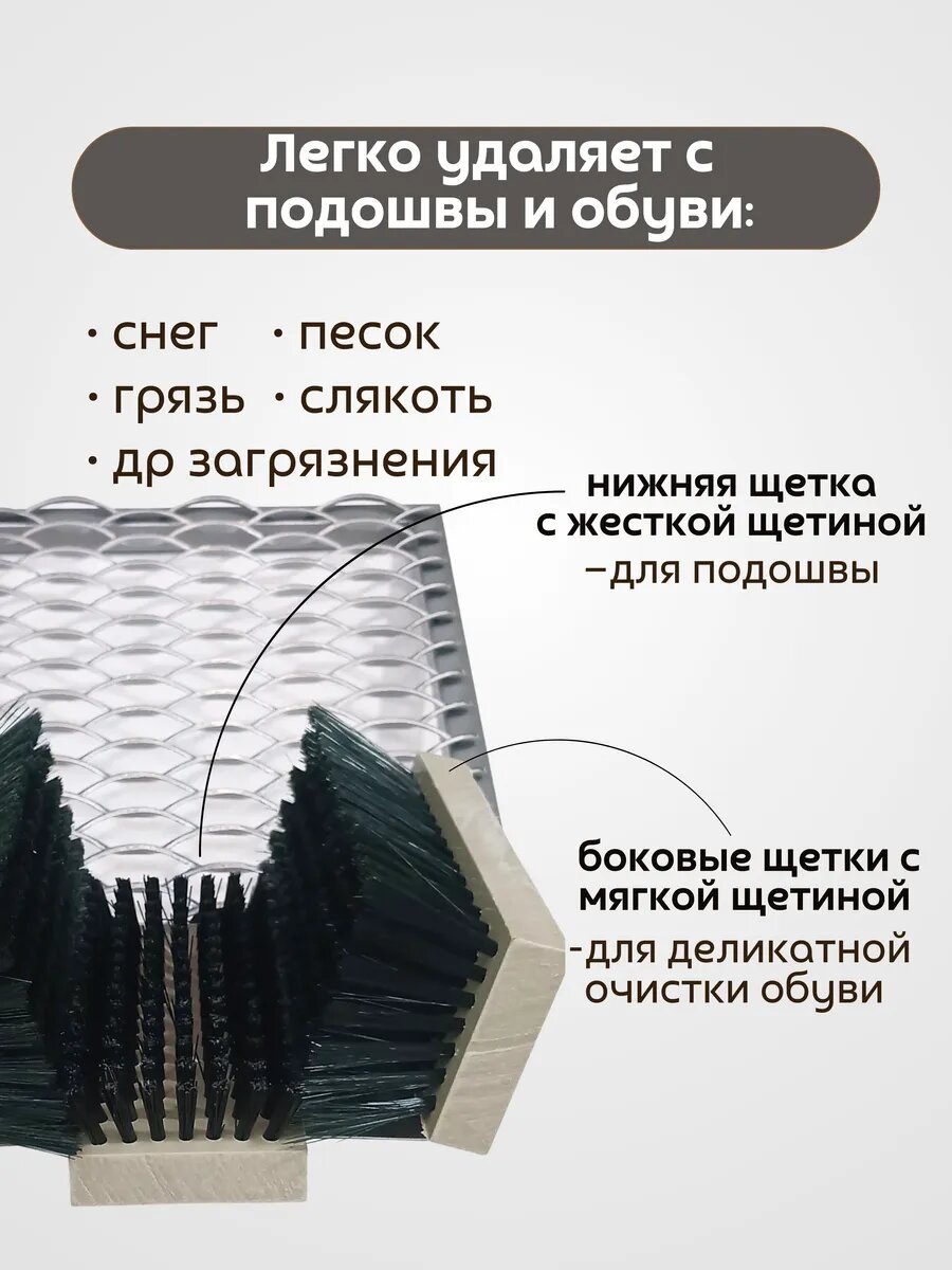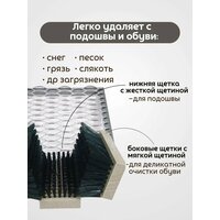 - Нижняя жесткая щетка быстро и эффективно удаляет грязь, песок и остатки снега с подошвы обуви.