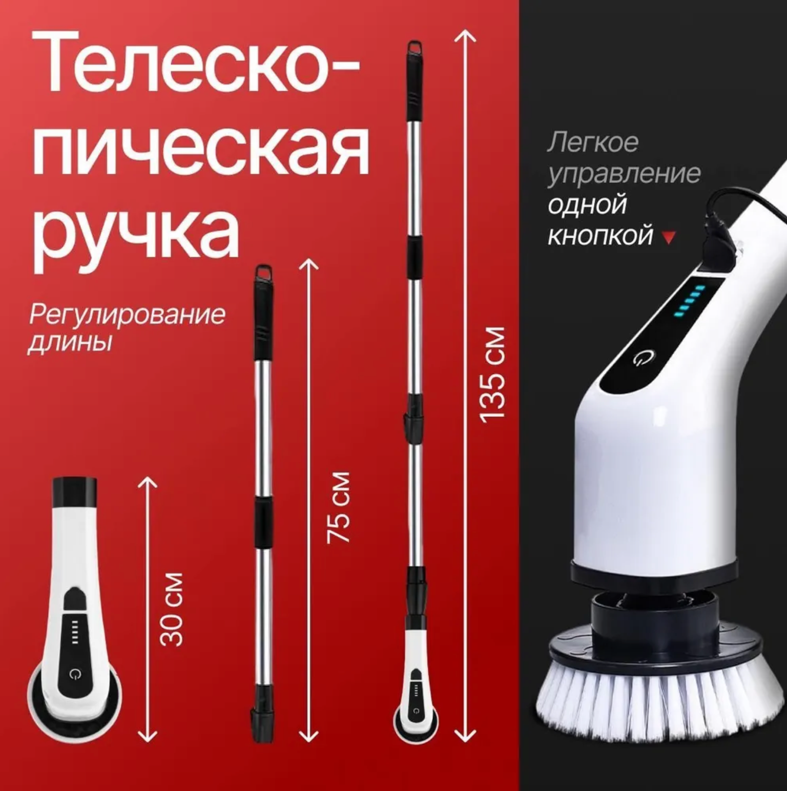 Если вы ищете эффективный и легкий способ уборки дома и кухни, то универсальная многофункциональная электрическая щетка - это то, что вам нужно! Она заменит швабру или электрошвабру. Чудо устройство имеет 2 скорости вращения и защиту от воды и обеспечивает сухую и влажную уборку. В комплект электро щетки входят: беспроводная вращающаяся ручка, зарядка от USB и набор из 7 насадок для электрощетки. 1. Заостренная компактная турбощетка с длинной ручкой для труднодоступных мест и для потолка, углов и швов, автомобильных дисков и колёс. 2. Маленькая хозяйственная насадка с жесткими щетинками для раковины и кухонной мойки. 3. Большая жесткая щеточка с длинным ворсом для стен и пола в ванной и душе, на кухне, бане ( бани ). Аппарат подойдет для кафеля, пластикового подоконника, стекла и зеркал. 4. С мягкой тканевой поверхностью автощетка для натирания кузова автомобиля и полировки. 5. Из искусственной шерсти для сбора пыли с стеклопакетов. 6. Из волокна от сильно загрязненных поверхностей духового шкафа, унитаза, плиты на кухне и известкового налета на стенах душевой кабины. 7. Круглая губка для очистки диванов, автомобилей и детейлинга, обуви. 8. Крепление для установки насадок. Окномойка ручная с длинной телескопической ручкой моющая позволяет справиться с чисткой вытяжки или высоких рам на балконе. Умная турбо щётка бытовая с ручкой для мытья окон и подметания полов и способна отмыть плинтуса. Она с легкостью справляется с различными типами поверхностей - от ковров до твердых полов. Прибор подойдет для ванн, дачи, мебели, бассейна и аквариума. Автоматическая турбощетка для чистки и для наведения порядка в домашних условиях, с её помощью вы сможете очистить ковры и ковровые покрытия, полы, мягкую мебель и автомобильный салон. Специальная роликовая щетина швабры и электростатическому действию эффективно собирает волосы, животные шерсть, пятна, пыльцу и даже мелкие частицы. Самоочищающийся уборочный инвентарь многоразовый будет отличным подарком на 23 февраля для мамы.