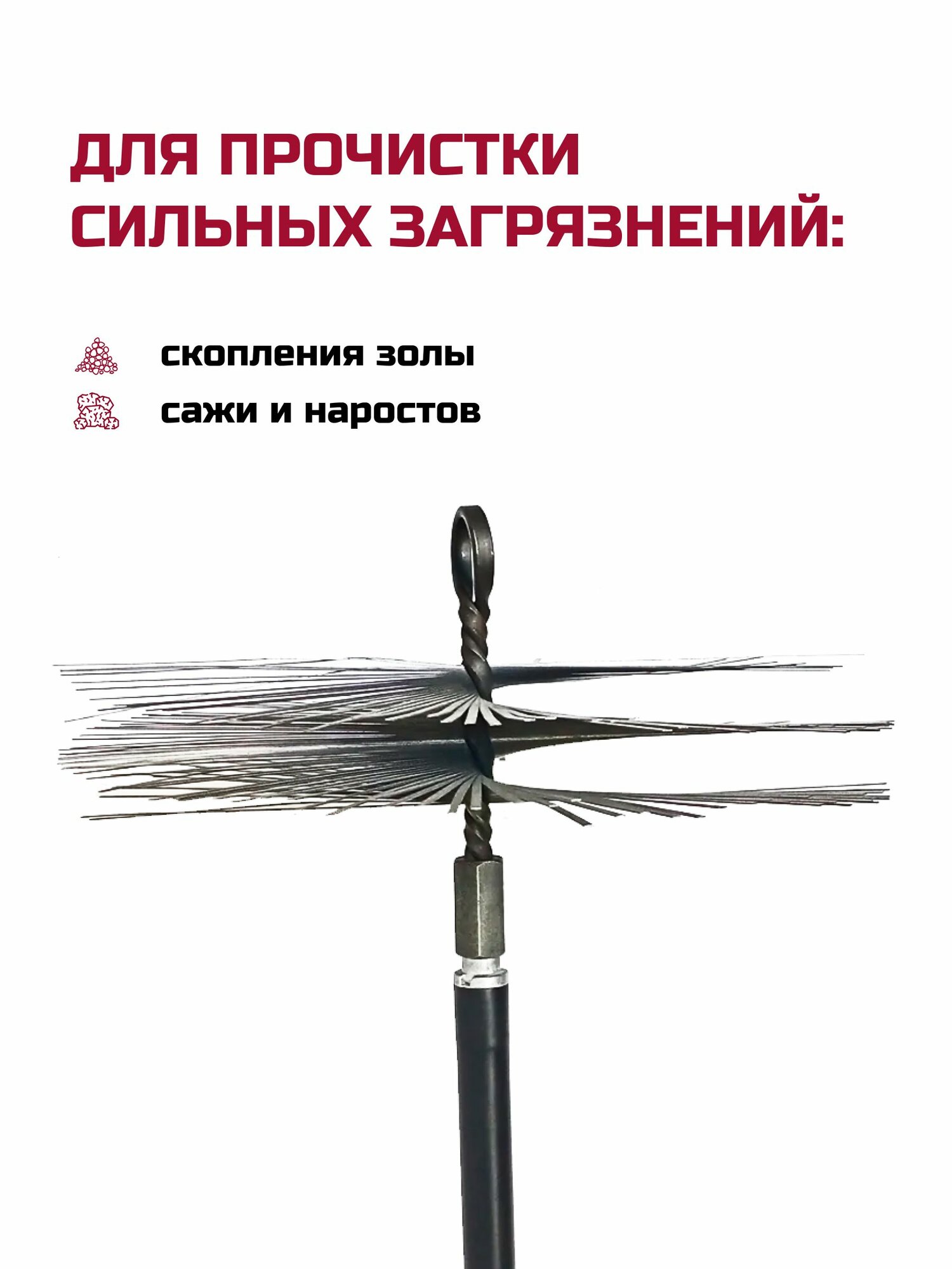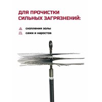 Щетка-ерш для дымохода из нержавеющей стали. Предназначена для прочистки кирпичных дымоходов, а при сильных засорах возможно произвести чистку и в дымоходах из нержавеющей стали. Металлические щетки росстин прочные, помогают избавиться от сильных загрязнений, скопления золы, сажи и наростов, сужающих диаметр внутри трубы. Предлагаемые диаметры: D100, D150, D200, D250, D300, D350 с гайкой и креплением кольцо. При выборе щетки ее диаметр должен соответствовать дымовой трубе.