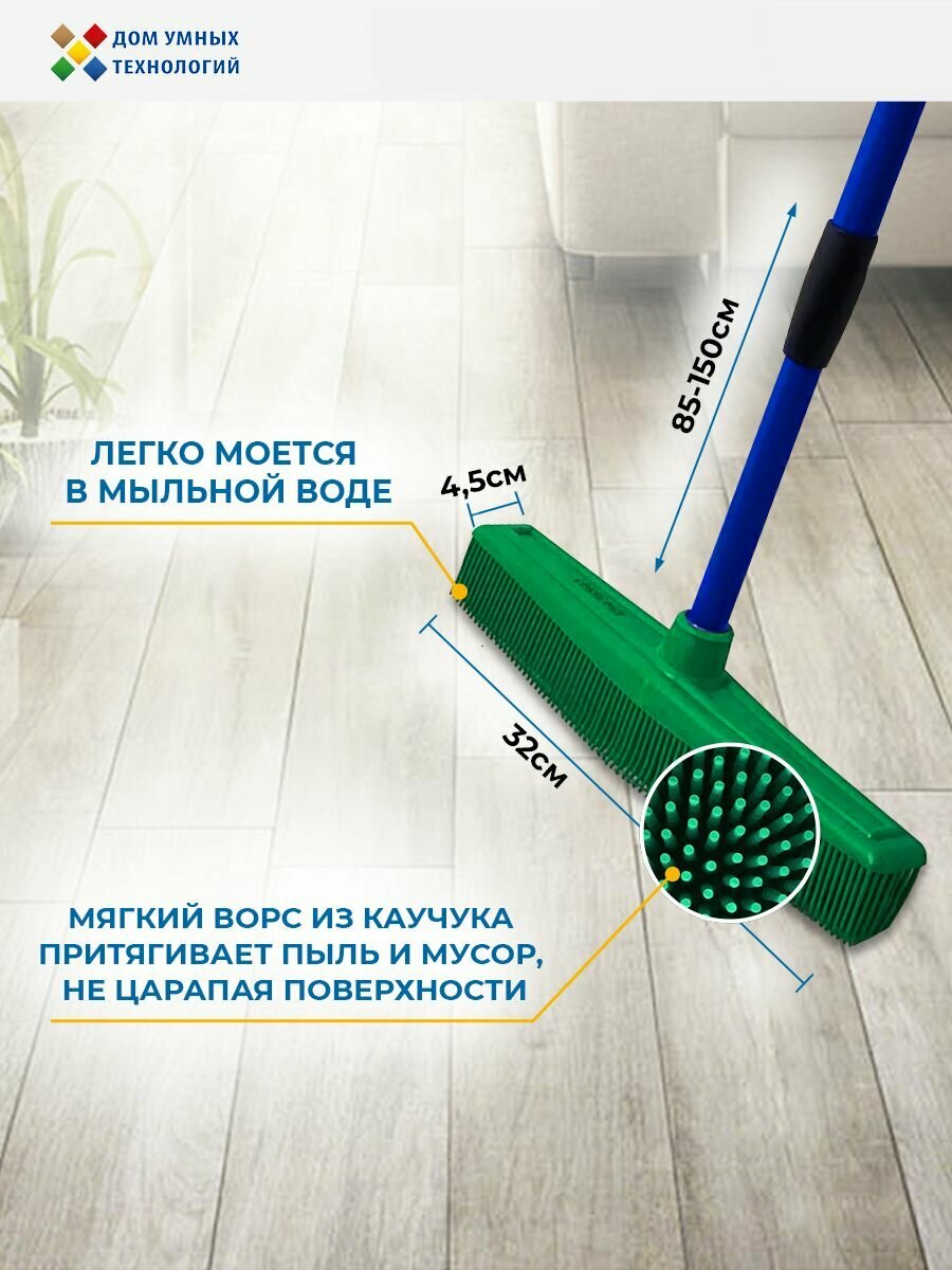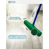 Щетка "Моримон" обладает густым длинным и мягким ворсом, который позволяет качественно подметать мрамор, паркет, линолеум, керамическую плитку, гладкие ковровые покрытия. Множественные ворсинки расположены очень близко друг к другу, что дает возможность собрать даже мелкий мусор, шерсть домашних животных, пыль. Мелкие пылинки и песчинки не поднимаются в воздух, а притягиваются к ворсу, поэтому щетка не пылит, как веник. Гибкая платформа дает возможность легко огибать ножки диванов и кресел, вплотную подходить к плинтусам. Телескопическая ручка от 80 до 150 см. Уход: щетки моются мылом или мягким моющим средством. Цвет: зеленая. Произведено в Испании компанией Morimon.