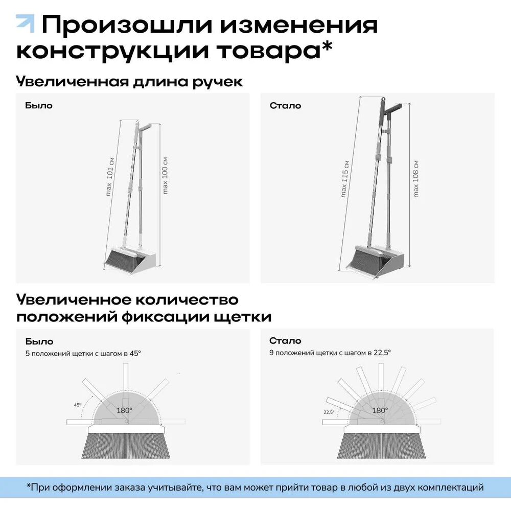 В комплекте с совком и щеткой для уборки вы получаете телескопическую секцию с рукояткой для щетки, телескопическую секцию с рукояткой и зажимом для совка, соединитель и совок.