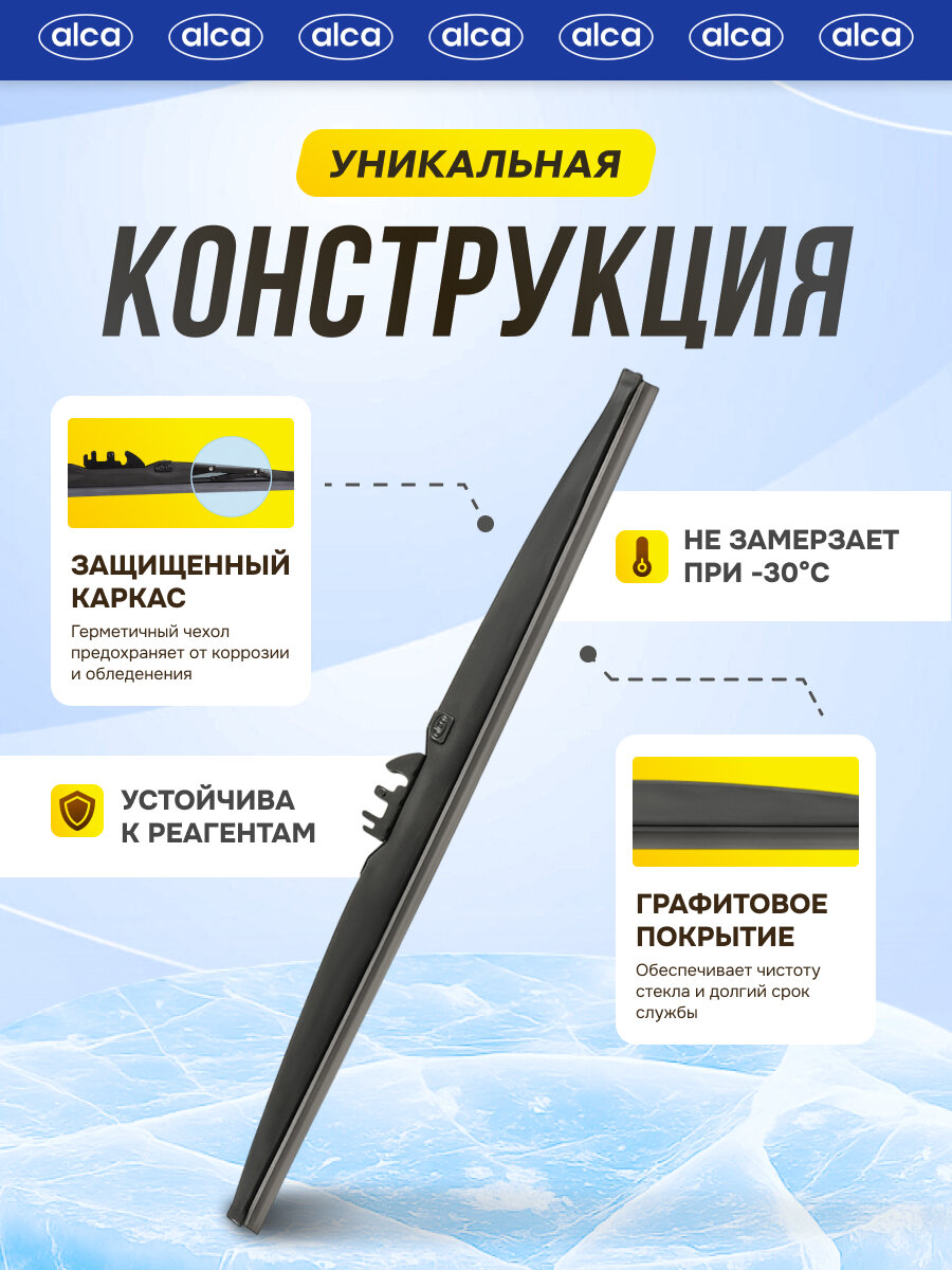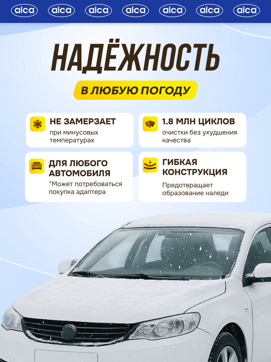 Щетка стеклоочистителя Алка зимняя 56 см (каркасная в чехле) разработана для надежной и стабильной работы в условиях суровой зимы, когда обычные щетки теряют эффективность. Прочный металлический каркас обеспечивает равномерное прижатие зимних щеток дворников 560 мм по всей длине, благодаря чему стекло очищается без пропусков, а плотный резиновый чехол защищает внутренний механизм зимних дворников Алка от обледенения и налипания мокрого снега, сохраняя подвижность всех элементов даже при сильных морозах. Резиновое лезвие зимних дворников Alca Winter 560 мм выполнено из материала, обладающего высокой устойчивостью к озону, агрессивным химическим реагентам и экстремальным перепадам температур. Используемая технология значительно замедляет процесс старения резины и позволяет увеличить срок службы автомобильных дворников Alca Winter 560 мм до 50% по сравнению с аналогами. Щетки стеклоочистителя с графитовым покрытием обеспечивают тихую и плавную работу без скрипов. Зимняя щетка стеклоочистителя имеет крепление под крючок (Hook) с возможностью докупить адаптеры для других видов крепления отдельно