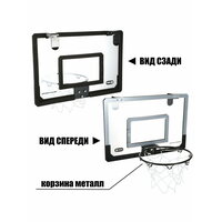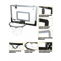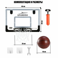 В комплект входят все необходимые аксессуары для игры: кольцо баскетбольное, сетка для баскетбольного кольца, щит баскетбольный прозрачный, металлические кронштейны для подвеса, комплект крепежа, мяч баскетбольный тихий 16 см, насос для мяча и крючки для подвеса щита.