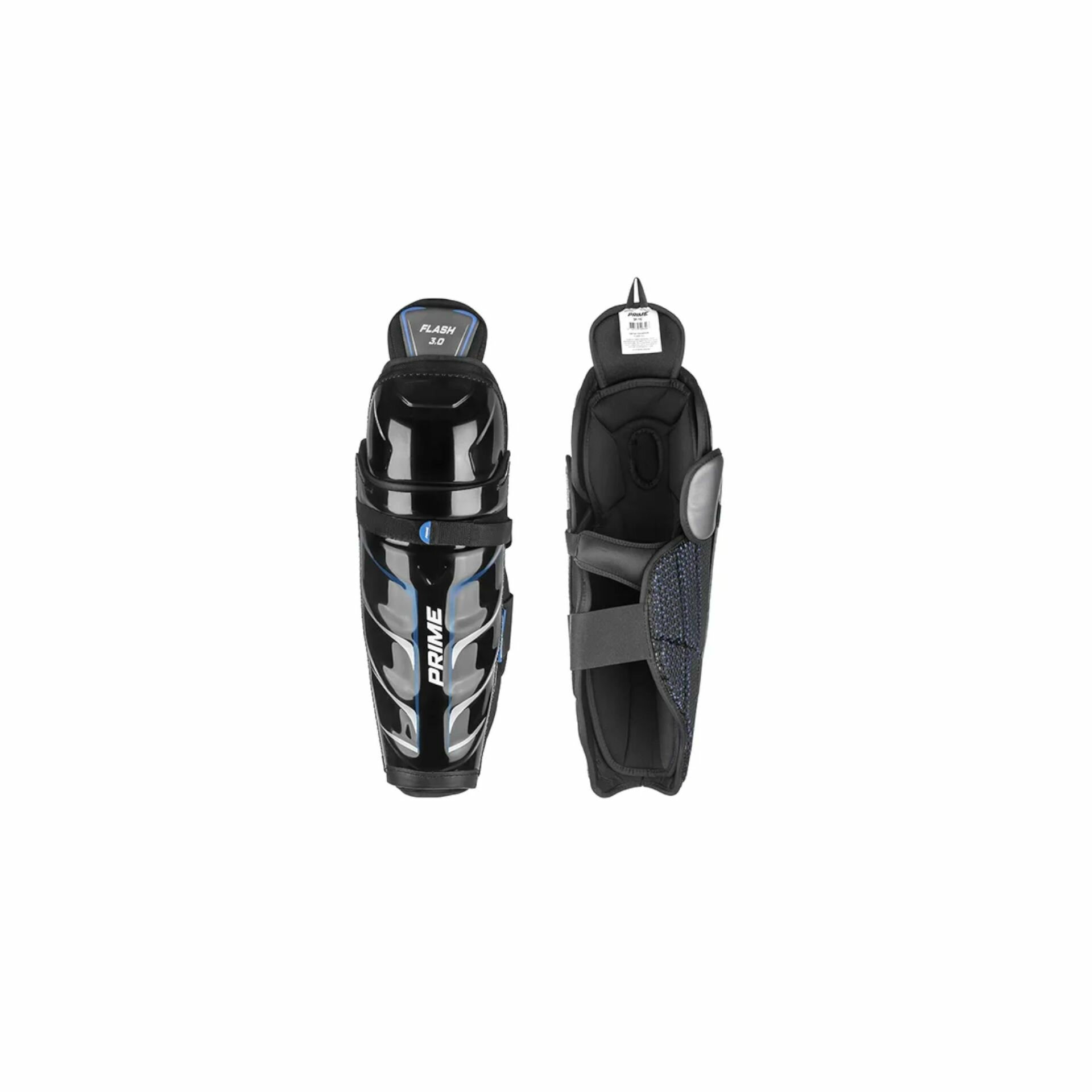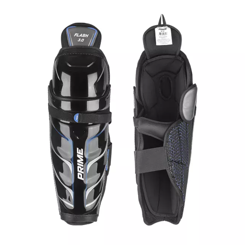 Щитки хоккейные PRIME Flash 3.0 SR. Зоны икр усилены 3D пеной, эффективно распределяет ударную нагрузку по площади и обеспечивает надежную защиту икр от ударов клюшкой, тычков и попадания шайбой, резинки изготовлены из неопрена, съемный лайнер.