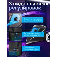 Маска для сварки оборудована сенсорами, которые обеспечивают мгновенное срабатывание храпового светофильтра, что способствует дополнительной защите и безопасности. Регулируемые настройки позволяют точно подстроить маску под индивидуальные потребности пользователя, будь то изменение уровня затемнения или чувствительности сенсоров.