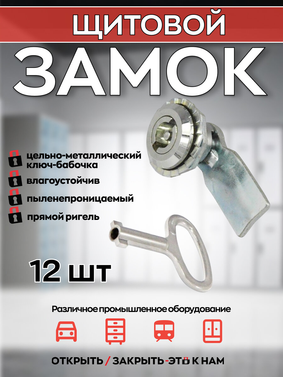 Комплект из 12-ти щитовых замков серии 705 с цельнометаллическим ключом. Применяются для установки в электро-щитовом оборудование, а также в многочисленной электротехнической продукции. Имеет два уплотнительных резиновых кольца. Внешнее резиновое уплотнительное кольцо, позволяет замку плотно прилегать к поверхности дверцы. Внутреннее - не позволяет пыли и влаге проникать внутрь и надежно защищает замок от влияния внешних факторов окружающей среды. Степень защиты замка IP66.