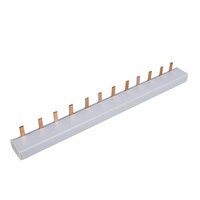 Назначение: Шины соединительные используются для удобного и безопасного соединения групп: - автоматических выключателей; – автоматических выключателей, управляемых дифференциальным током (АВДТ); – выключателей, управляемых дифференциальным током (УЗО) и других модульных устройств. Применение: В шкафах, щитах, сборках. Преимущества: Возможность коммутации группы автоматических выключателей без использования провода Конструкция: Однополюсная гребенка состоит из одной сплошной медной пластины прямоугольного сечения (шинки) на которой выполнены ответвления через определенное расстояние для параллельного подключения модульных автоматов, УЗО, дифавтоматов, контакторов . Пластина помещается в специальный пластиковый корпус из негорючего материала. Двух и трехполюсные шины имеют соответственно две и три сплошные пластины отделенные друг от друга изоляционной перегородкой. Материалы: Изолирующий профиль изготовлен из самозатухающего пластика Комплектация: Паспорт