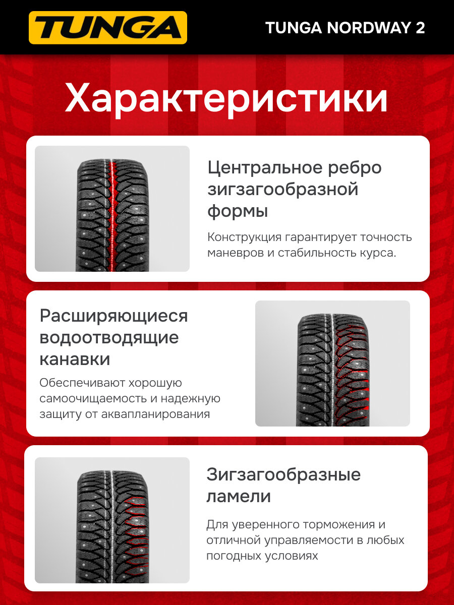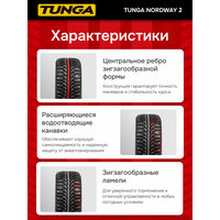 Tunga Nordway 2 является шипованной зимней резиной, для которой характерно высокое качество и доступная цена. Модель идеально подходит для эксплуатации в суровых зимних условиях. Для шины характерны высокие ездовые характеристики на заснеженном или обледенелом покрытии. Износоустойчивость способствует обеспечению многолетней эксплуатации. Покрышки имеют симметричный протекторный рисунок направленного типа. Для автошины характерна густая система ламелей. За счет особого резинового состава обеспечивается одновременно целостность системы и высокий кромочный эффект. Покрышка пользуется спросом за счет длительного эксплуатационного срока.