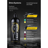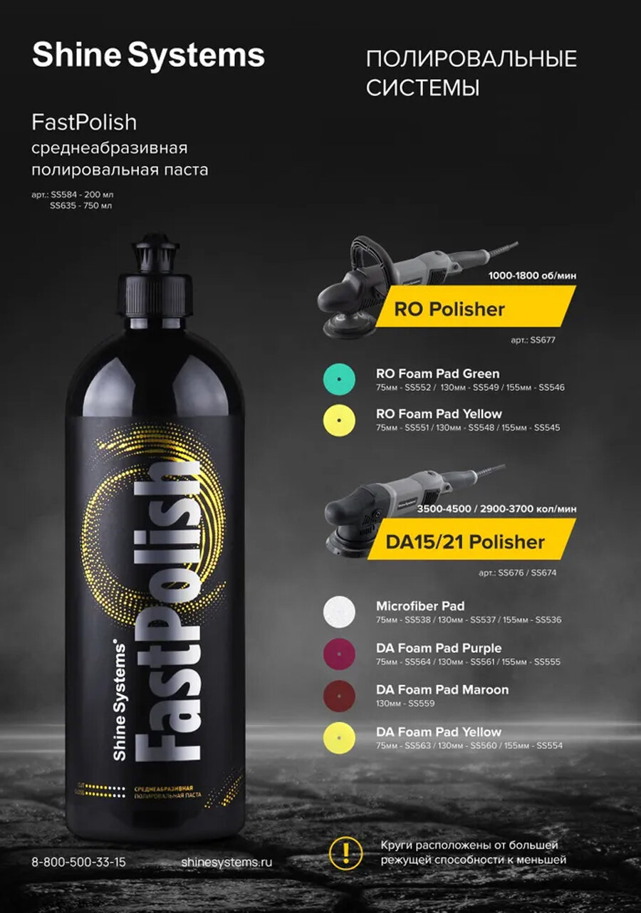 Высокоэффективная полировальная паста для удаления средней риски от P2000 на всех видах лакокрасочного покрытия – мягких, средних, твердых и гелькоатах. Предназначена для работы со всеми видами полировальных машинок – ротационных, эксцентриковых со свободным и принудительным вращением. Рекомендуется применять полутвердые поролоновые, меховые и микрофибровые круги. Паста обеспечивает быстрое устранение дефектов при минимальном пылеобразовании, высокий уровень скольжения и отсутствие залипаний в процессе работы. Shine Systems FastPolish – среднеабразивная полировальная паста, 750 мл Высокоэффективная полировальная паста для удаления средней риски от P2000 на всех видах лакокрасочного покрытия – мягких, средних, твердых и гелькоатах. Предназначена для работы со всеми видами полировальных машинок – ротационных, эксцентриковых со свободным и принудительным вращением. Рекомендуется применять полутвердые поролоновые, меховые и микрофибровые круги. Паста обеспечивает быстрое устранение дефектов при минимальном пылеобразовании, высокий уровень скольжения и отсутствие залипаний в процессе работы. Состав: Оксид алюминия, алифатические углеводороды, изопарафины, краситель, отдушка. Применение: Равномерно распределите пасту на обрабатываемом участке. Приступайте к полировке на низких оборотах с постепенным повышением скорости работы. На старте работ рекомендуется полностью пропитать поверхность поролонового круга пастой. Полировать до появления чистой от пасты поверхности. После подхода проверить состояние поверхности с помощью обезжирки Shine Systems IPA либо Check&Prep. При необходимости повторить подход. Не перегревать поверхность выше 60 градусов. Меры предосторожности: Беречь от детей! При попадании в глаза либо на поверхность кожи – промыть большим количеством воды. При необходимости обратиться к врачу. Соблюдайте технику безопасности – используйте перчатки и защитные крема. Условия хранения: Не замораживать! Хранить при температуре от 50С до 250С. Избегать попадания прямых солнечных лучей. Срок годности: 3 года. Дата производства: см. на упаковке.