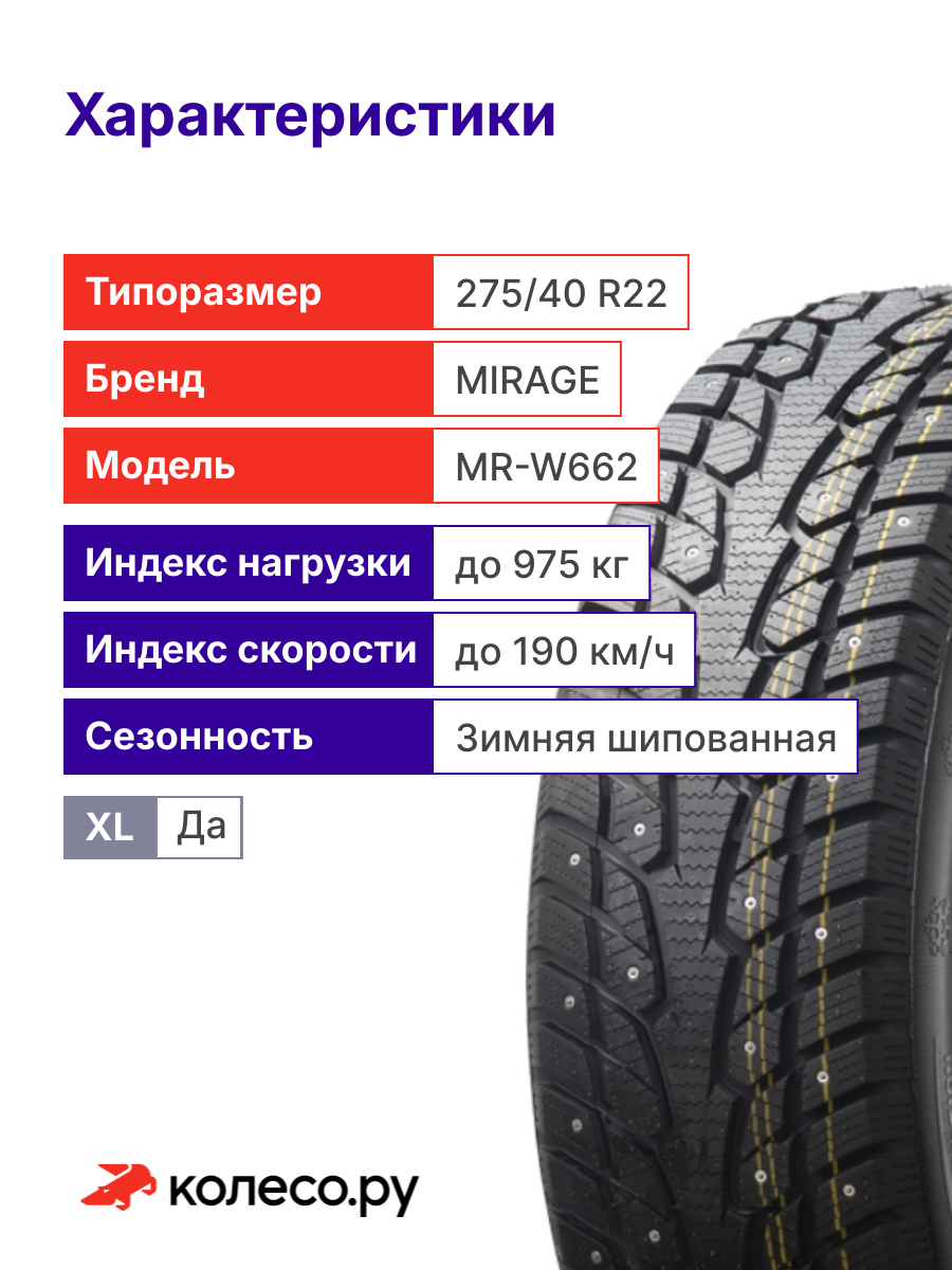 Шины зимние MIRAGE MR-W662 275/40 R22 107T XL шипованная зимняя резина: сравнение цен, характеристики, фото, актуальное наличие и цены.