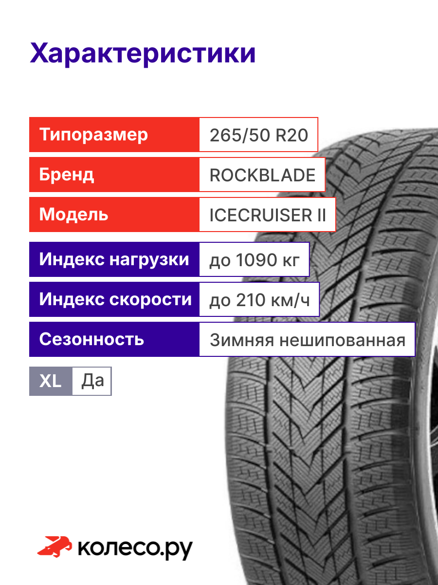Зимние шины RockBlade IceCruiser II 265/50 R20 111H XL SUV — это качественные автомобильные шины, предназначенные для установки на легковые автомобили SUV и рассчитанные на эксплуатацию в условиях зимы.