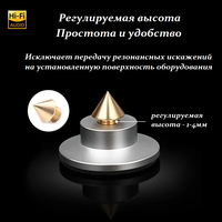 Erumpent SP-001 является опорой (стойкой) для акустических систем и другого Hi-Fi оборудования, например винилового проигрывателя. Обладая всеми достоинствами стоек традиционной конструкции, SP-001 имеет ряд существенных преимуществ, в частности решает известную проблему царапин, которая неизбежно возникает при использовании обыкновенных шипов. Использование шипов в качестве стоек для колонок и/или аппаратуры звуковоспроизводящего тракта разрывает нежелательную механическую связь оборудования с поверхностью, на которой оно установлено. Это предотвращает распространение паразитных вибраций и их влияние на процесс звуковоспроизведения. С физической точки зрения это означает концентрацию всего веса оборудования на поверхностях крайне малой площади, что приводит к чрезвычайно высокому давлению в точке опоры. Как результат - заметное улучшение звуковой сцены и увеличенная отдача на низких частотах. Благодаря качеству применяемых материалов и высокой точности изготовления стойки имеют крайне малую площадь контакта опорного острия с основанием, а значит - и чрезвычайно эффективную механическую развязку оборудования и поверхности, на которой это оборудование установлено. Кроме того, благодаря особой конструкции обеспечивается эффективное подавление собственных внутренних резонансов стойки, которые также негативно влияют на качество звуковоспроизведения. Опоры выдерживают вес до 50 килограммов (на четыре шипа). Вы можете спокойно устанавливать на шипы любые существующие акустические системы и другое Hi-Fi оборудование.
