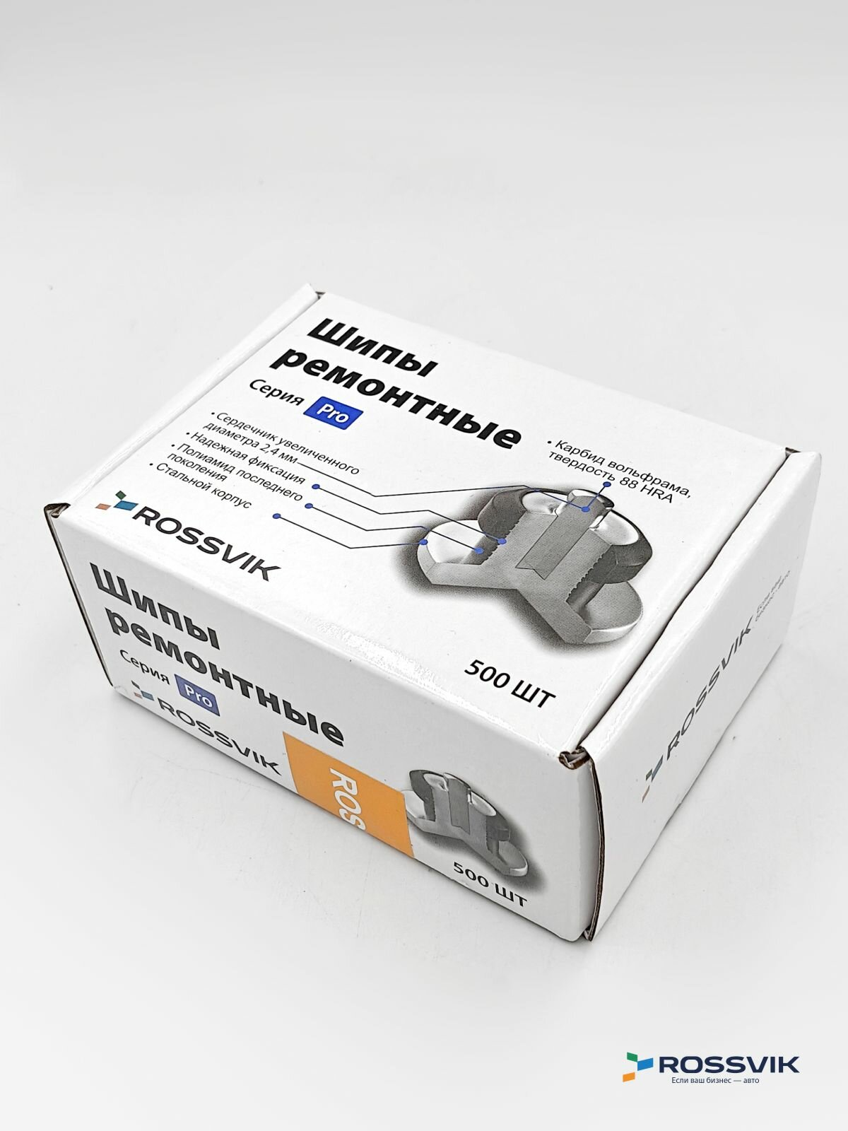 Профессиональная фасовка ROSSVIK PRO (12-6-2, длина 6 мм) для ремонтной ошиповки шин. Сердечник 2,4 мм, корпус стальной, втулка полимерная. Установка в лунки глубиной 5–6 мм. Фасовка 500 шт рассчитана на комплект из четырёх колёс легкового автомобиля (по 90–130 шт/колесо).