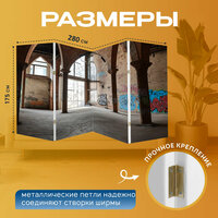 Ширма "Лофт, где изображены детали архитектуры с высокими арками и нестандартными конструкциями. граффити на" перегородка для зонирования комнаты с принтом 280x175 см. на холсте