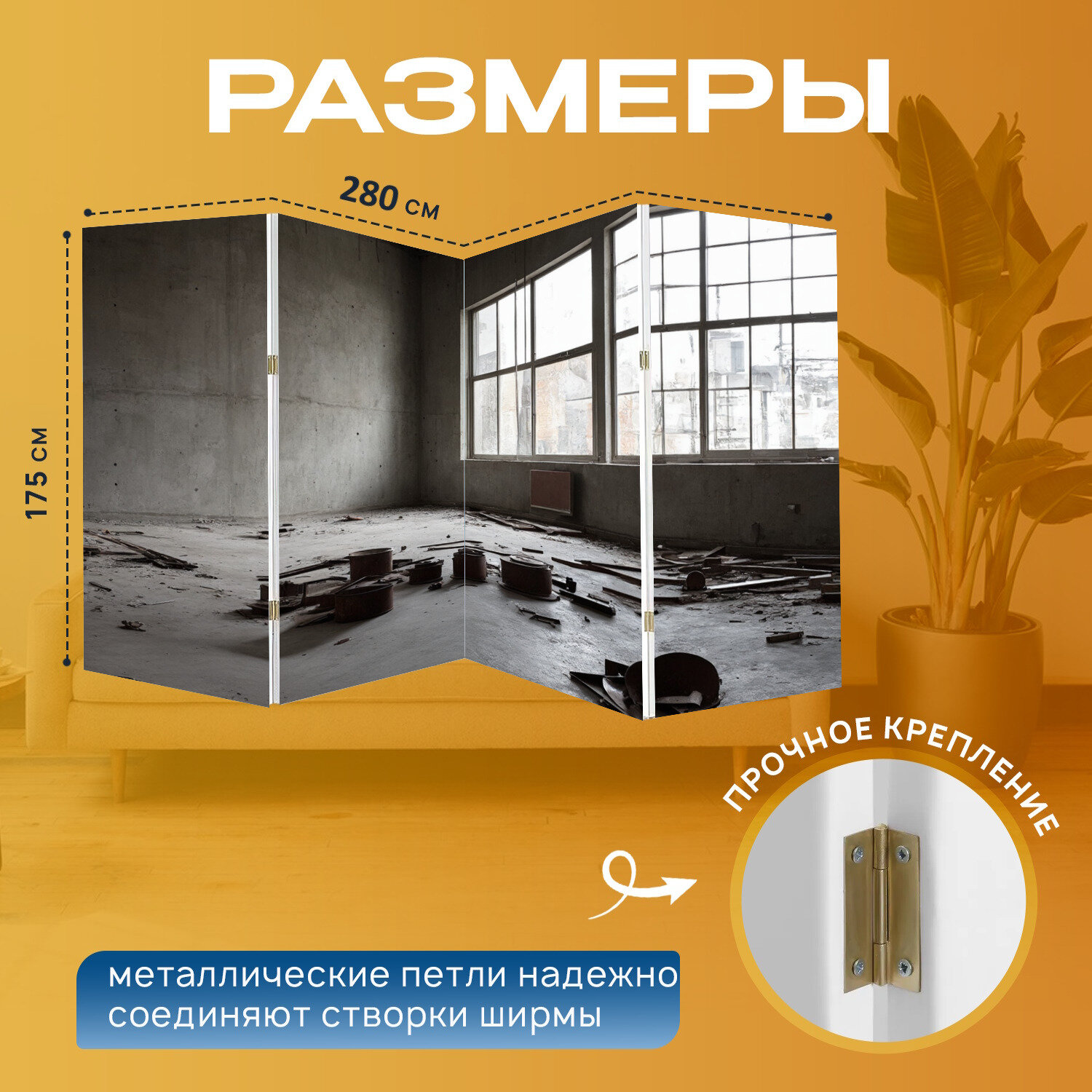 Ширма "Лофт, изображающие нежилое помещение с гладкими бетонными стенами и большими окнами. на полу лежат старые" перегородка для зонирования комнаты с принтом 280x175 см. на холсте