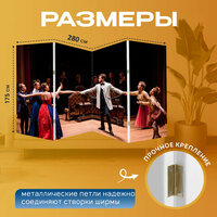 Ширма музыкантам "Сцена из классического театра, где музыка и драма переплетаются, с использованием масла и яркой палитры" перегородка для зонирования комнаты с принтом 280x175 см. на холсте