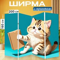 Ширма "Мягкая кошка, играющая с куском пачки, которая случайно взлетела, стиль детской иллюстрации с мягкими" перегородка для зонирования комнаты с принтом 200x160 см. на холсте