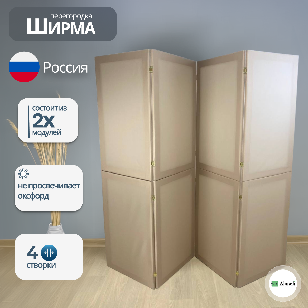 Купить Ширма перегородка для зонирования комнаты бежевая 4 створки модульная с доставкой по всей России.