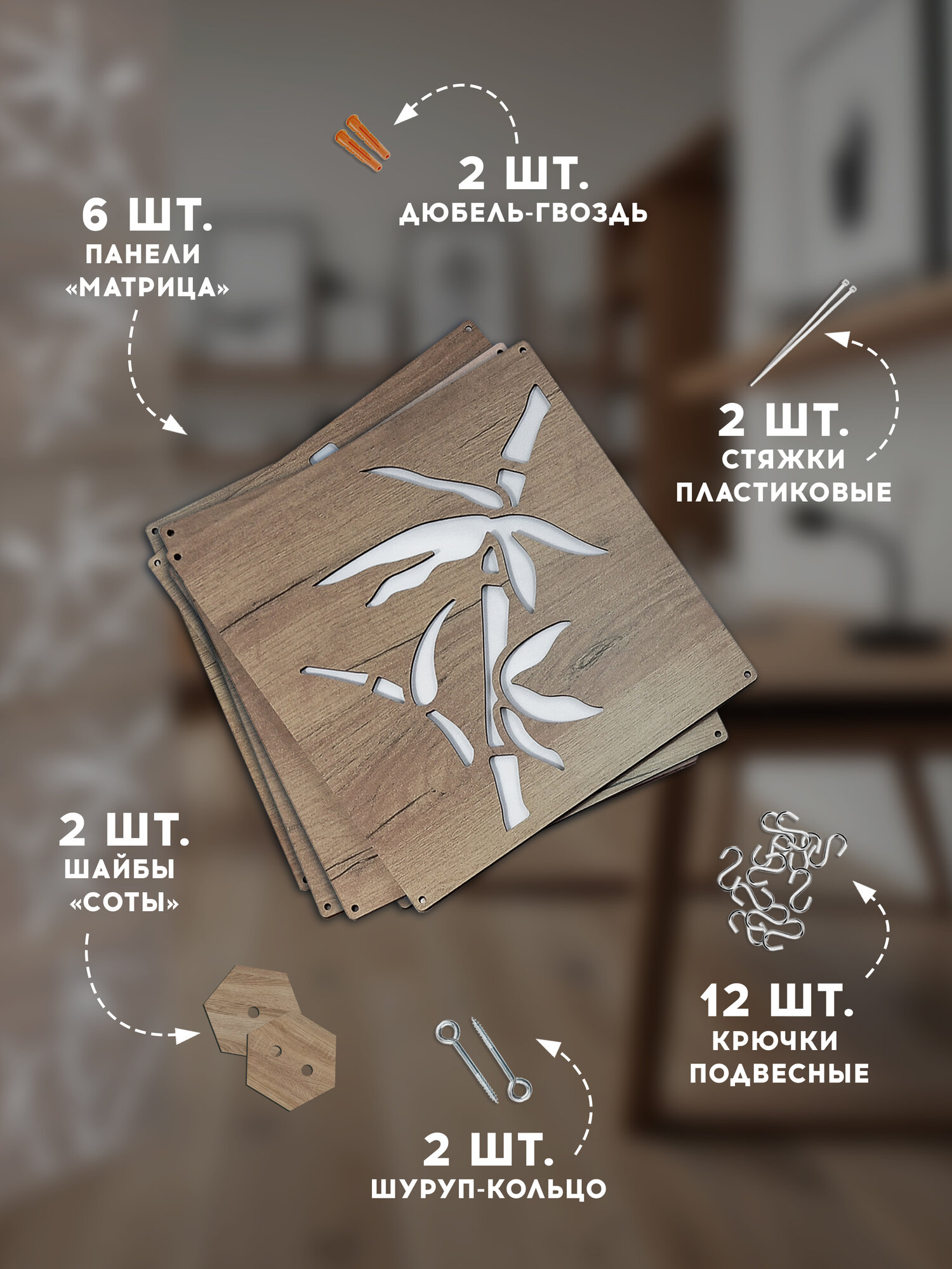 Ширма подвесная – модульная перегородка для зонирования помещения от Российской фабрики MiKs. Хотите стильный современный и уникальный интерьер в своей квартире, доме, ресторане или офисе? Не знаете, как зонировать пространство в своей гостиной, спальне, кухне, в кабинете или детской комнате, чтобы это было красиво, функционально и недорого? Компания Микс знает решение. Декоративный элемент мебели для визуального зонирования пространства – подвесная ширма. Это декоративная перегородка, сделанная из высококачественных материалов, имитирующих дерево разных пород. Ширма для зонирования пространства имеет отменные эстетические качества, благодаря чему служит настоящим украшением интерьера, подчеркивая стиль и элегантность оформления. Подвесная ширма для зонирования пространства от компании Микс выглядит стильно, красиво и современно и подойдет в любой интерьер. Ширма состоит из 6 штук панелей, размером 38*38 см с универсальными креплениями, что позволяет создать свою индивидуальность рисунка ширмы. Проявите свою фантазию и создайте уникальный индивидуальный дизайн своей ширме! Если четко следовать по инструкции, то перегородка очень легко и быстро собирается. В комплект уже входит качественный основной крепёж для монтажа перегородки к деревянному или бетонному потолку. Если требуются дополнительные панели, то их можно отдельно докупить. Минимальное количество 6 шт. Красивые и качественные декоративные ширмы от Микс впишутся в любой интерьер дома, квартиры, дачи. Интерьерные перегородки - ширмы будут стильно смотреться в ресторане, салоне красоты, в медицинских учреждениях, в офисе, в детском саду и других пространствах. Она поможет разделить и улучшить функциональность вашего пространства и создать более комфортную обстановку Так как перегородка пропускает часть света, то можно создавать интересные эффекты с тенями и освещениями. Разделение пространства: модульная перегородка - ширма может помочь разделить ваше помещение на разные зоны, что поможет создать более функциональное и удобное пространство. Например, вы можете использовать перегородку - ширму, чтобы разделить гостиную и зону для работы .