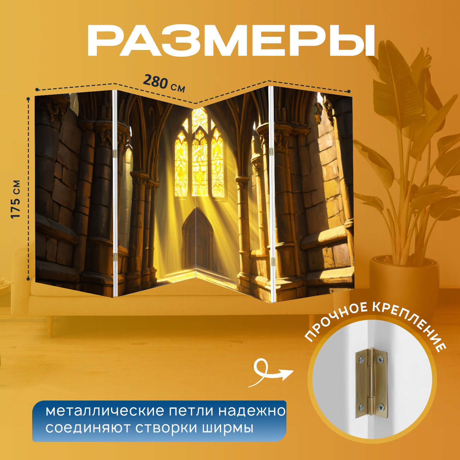 Ширма "Сказочный замок с желтыми витражами, пронизывающими яркими лучами света в длинный коридор, создавая игру" перегородка для зонирования комнаты с принтом 280x175 см. на холсте