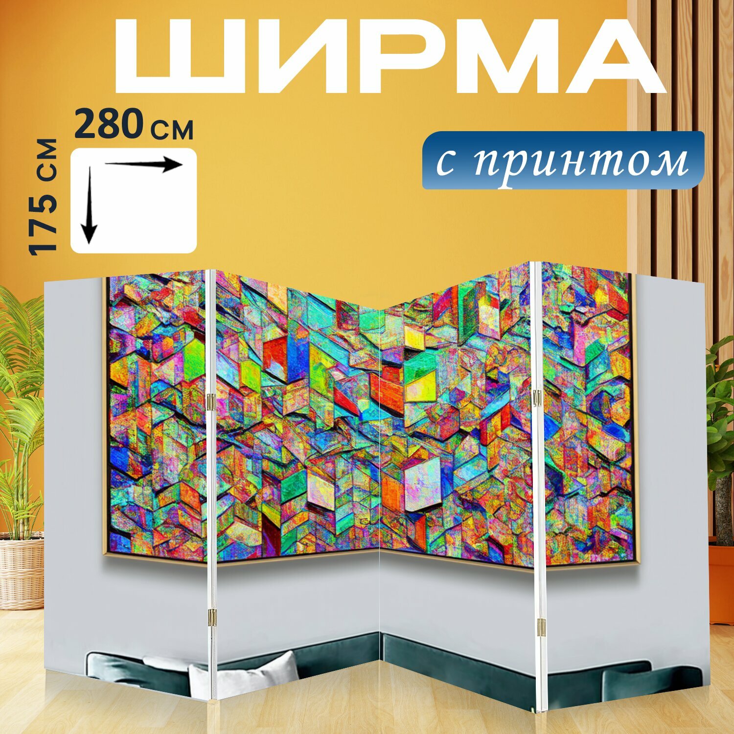 Ширма в зал, в гостинную «Арт-объект с многоцветными геометрическими формами, выполненный в технике коллажа. эта» перегородка для зонирования комнаты с принтом 280×175 см. на холсте