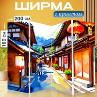 Ширма «Япония показывает улицы старого киото с традиционными деревянными домами и фонариками на улицах. техника:» перегородка для зонирования комнаты с принтом 200×160 см. на холсте