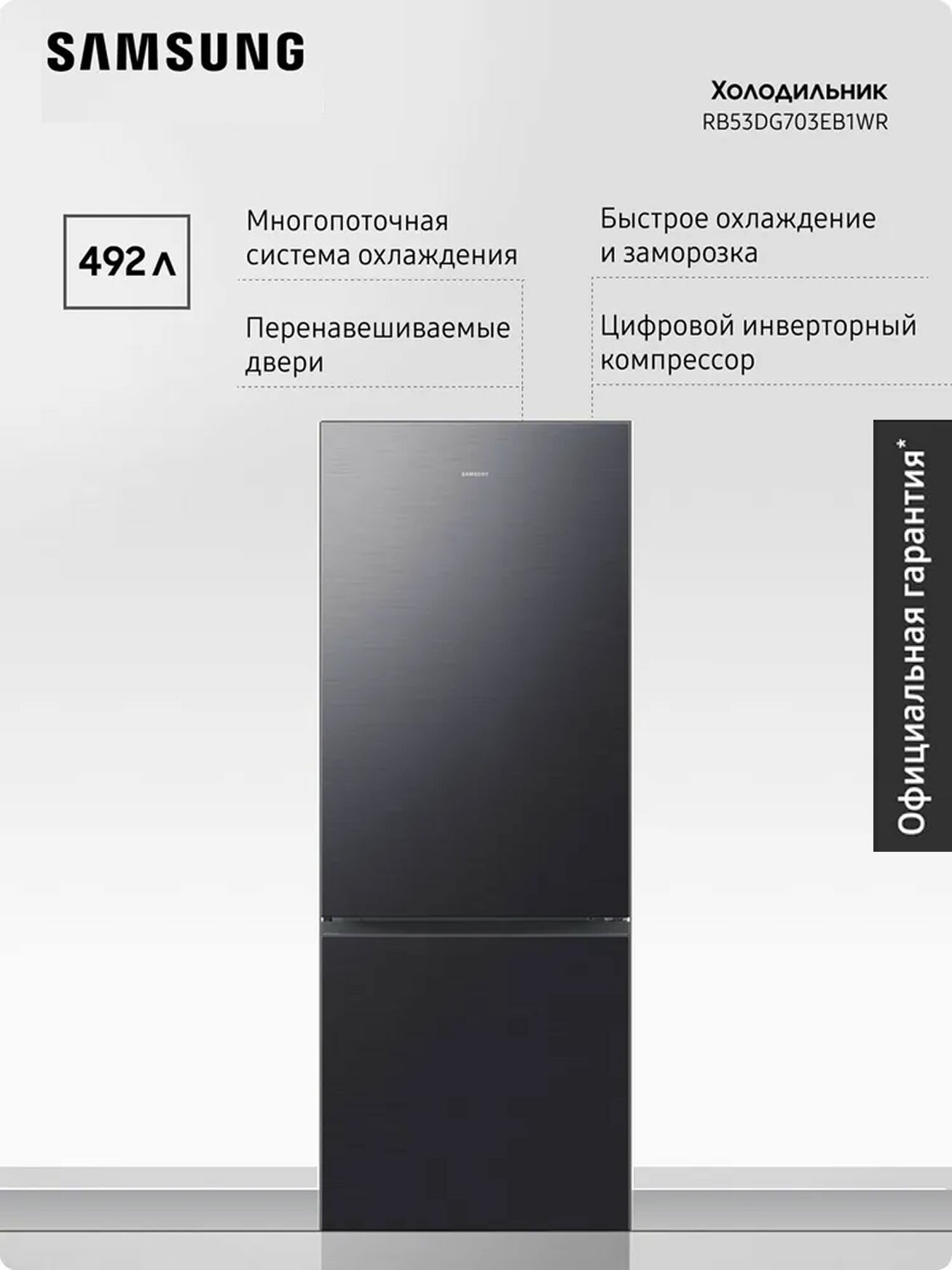 Купить Широкий холодильник с нижней морозильной камерой Samsung RB53DG703EB1WR, 492 л, SmartThings AI Energy, цифровой инверторный компрессор, черный с доставкой по всей России. Широкий холодильник с нижней морозильной камерой Samsung RB53DG703EB1WR, 492 л, SmartThings AI Energy, цифровой инверторный компрессор, черный: сравнение цен, характеристики, фото, актуальное наличие и цены.