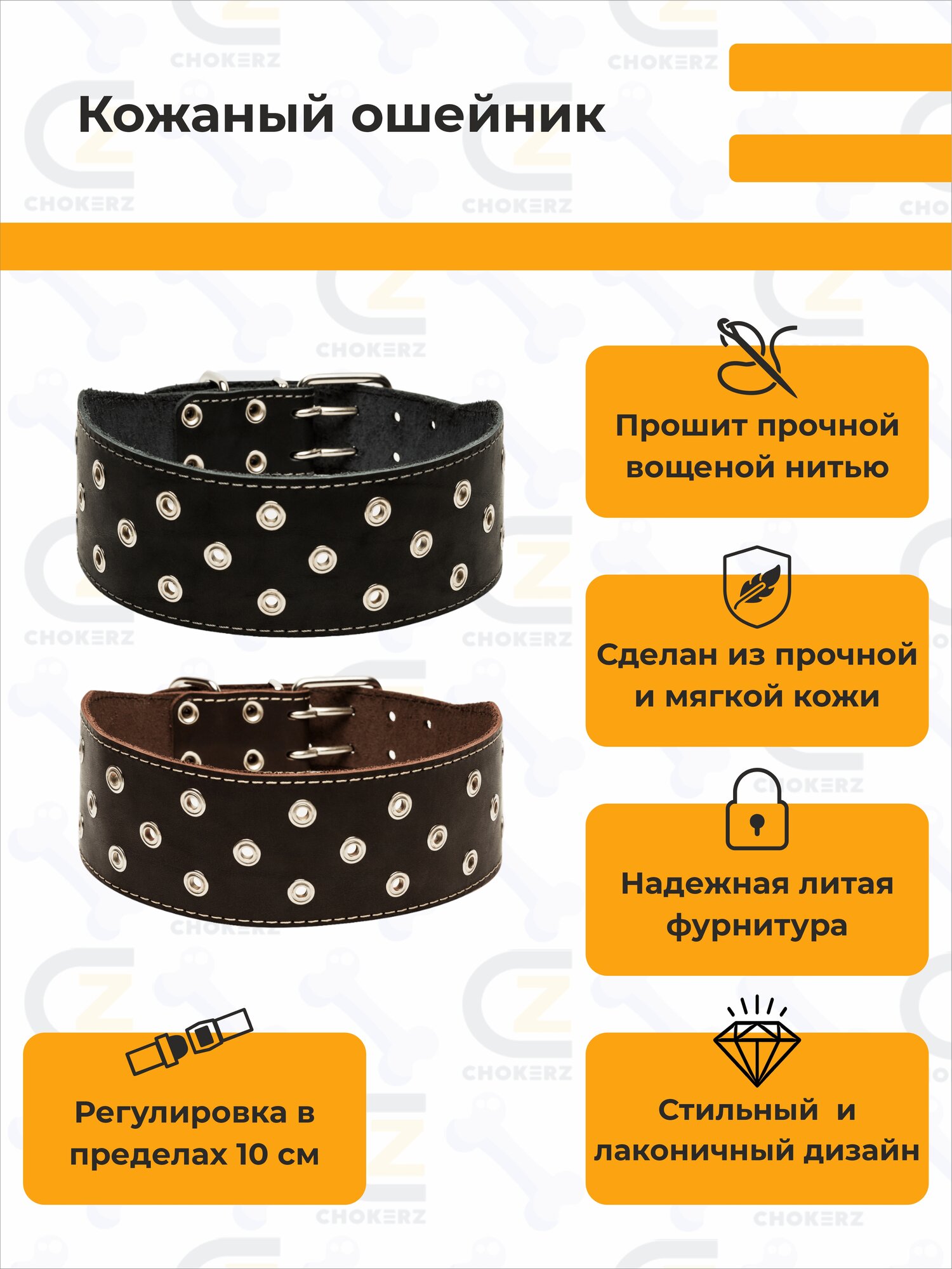 Широкий кожаный ошейник CHOKERZ для средних и крупных пород собак. На шею 55-65 см. Ширина — 70 мм.: сравнение цен, характеристики, фото, актуальное наличие и цены.