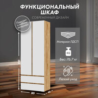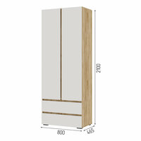 Шкаф оснащен двумя распашными дверями с четырехшарнирными накладными петлями, что обеспечивает плавное и бесшумное открывание. Внутри шкафа расположены четыре полки и штанга для вешалок, а также два выдвижных ящика с шариковыми направляющими для удобства хранения.
