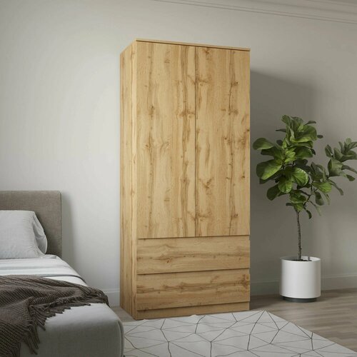 Шкаф Акро в цвете дуб вотан это шкаф распашной без зеркала, который благодаря своему минимализму и лаконичному виду впишется в любой интерьер. Шкаф для одежды идеален для спальни, детской, прихожей, гостиной и для офиса. Обладает небольшими габаритами, но при этом очень вместительный. Шкаф состоит из двух частей: с левой стороны вещи будут располагаться на съемных полках на полкодержателях, а правая сторона оснащена хромированной штангой для плечиков. В нижней части шкафа располагаются два выдвижных ящика на роликовых направляющих, незаменимые для хранения постельного белья. На фасаде отсутствуют ручки, функцию ручек выполняет сам фасад. Открывание ящиков и дверей производится за счет пространства между планками и фасадом.