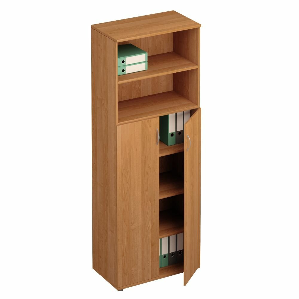 Шкаф имеет регулировочные опоры, три регулируемые по высоте полки и две фиксированные полки Проемы шкафа обеспечивают размещение стандартных папок CORONA высотой 320 мм На боковинах шкафа имеются отверстия под установку дверей Шкаф укомплектован двумя дверями из ДСтП без замка Дверями может быть закрыто два любых из трех имеющихся проемов шкафа по желанию Заказчика Конструктивное исполнение обеспечивает наличие открытой ниши, расположенной в верхней или нижней части шкафа Шкаф собирается на эксцентриковой стяжке Задняя стенка изготовлена из ДВП 3,2 мм и установлена в пазы корпуса шкафа Шкаф поставляется в разобранном виде