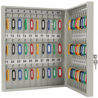 Предназначены для упорядоченного размещения и защиты от несанкционированного использования ключей. В корпусе предусмотрены отверстия для крепления. Изготовлены из стали 0,9 мм. Оснащены металлическими крючками для навешивания ключей. Ключевой замок. Количество крючков для ключей - 60шт. В комплект ключниц входят пластиковые цветные брелоки, рассчитанные на количество ключей и самоклеящиеся номерки. Вес 3.7 кг