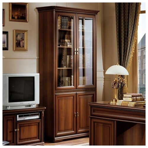 Одним из обязательных предметов в интерьере кабинета является шкаф для книг. Шкаф имеет два отделения с полками. В верхней застекленной части расположены четыре полки. В нижней части шкафа за глухими фасадами расположены две полки. Теплый ореховый цвет мебели оттеняет благородная патина. Декоративные накладные элементы ручной работы, фурнитура цвета античной бронзы подчеркивают классический стиль мебели.