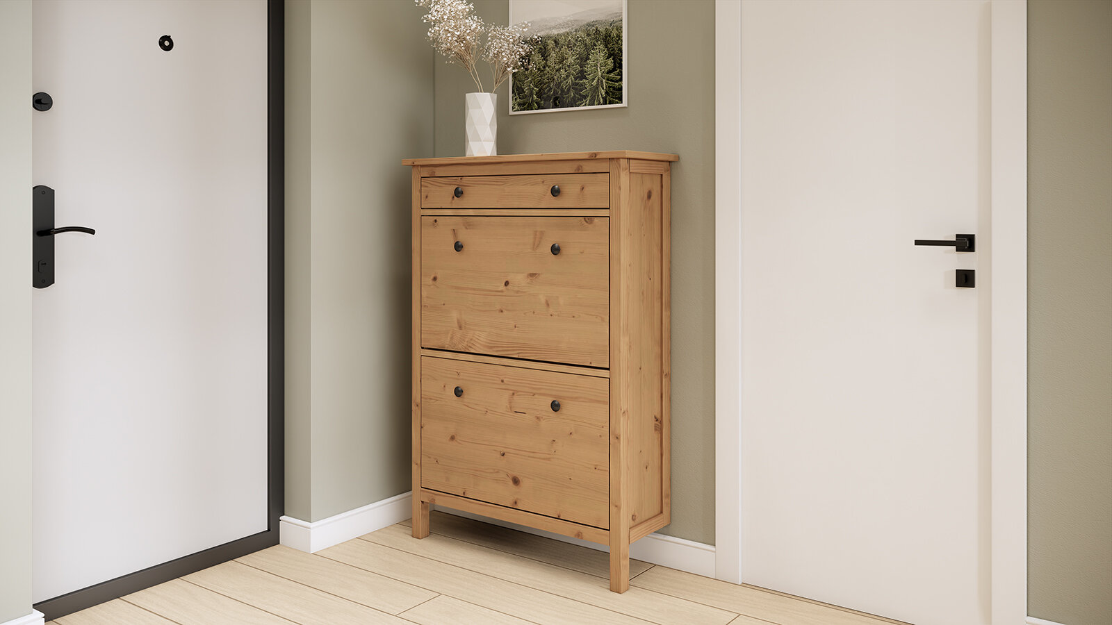 Элегантный дизайн: Изготовленная из прочного массива дерева и выполненная в стильном цвете, обувница привнесет в ваш дом атмосферу уюта и современности. Не беспокойтесь о том, что обувь будет заметна — закрытая конструкция поможет скрыть её от посторонних глаз.