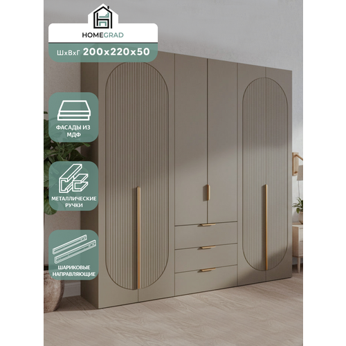 Глубокий оттенок мокко гармонично сочетается с глиняно-серым корпусом из ЛДСП, создавая спокойную и уютную атмосферу. Металлические ручки с теплым золотистым отливом подчеркивают премиальный характер модели и приятно ложатся в руку.