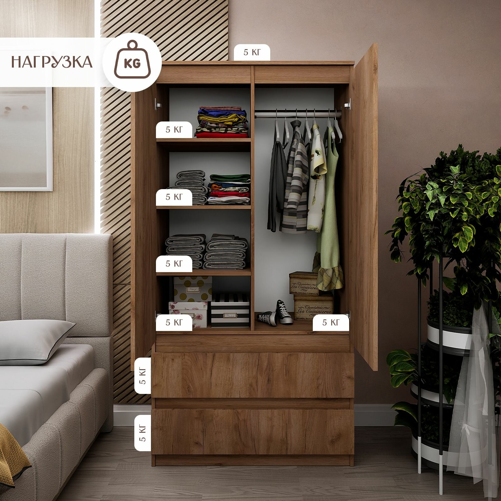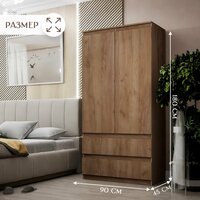 Шкаф оснащен двумя распашными дверями и двумя вместительными ящиками, что обеспечивает удобный доступ к содержимому и позволяет легко найти нужную вещь. Внутри шкафа расположены три полки и штанга для вешалок, что позволяет хранить одежду различных типов и сезонов.