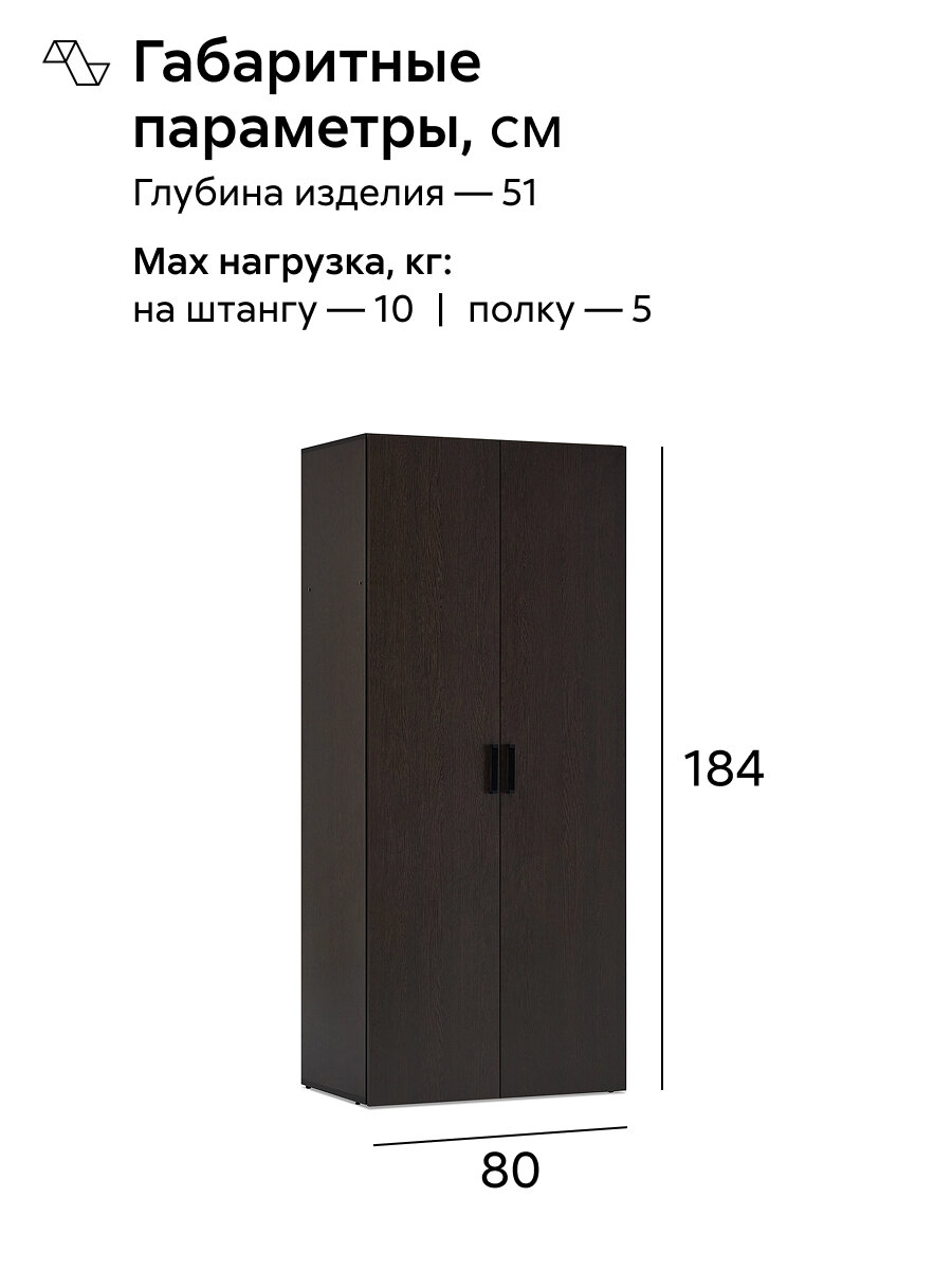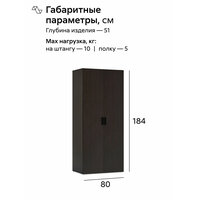 Этот предмет мебели имеет ширину 80 см и высоту 184 см, что позволяет разместить его даже в небольших помещениях. При этом глубина составляет 51 см, это обеспечивает достаточное пространство для хранения вещей.