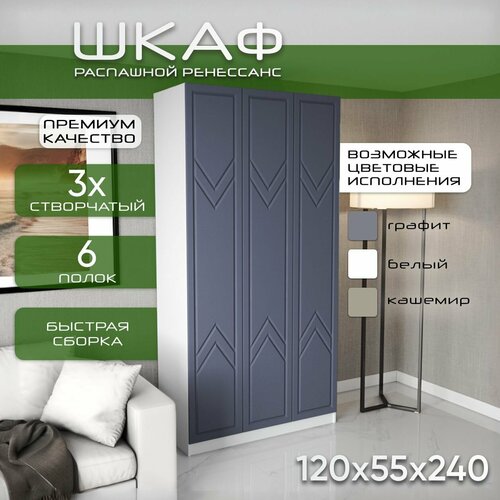 Шкаф распашной 120х55х240 Ренессанс станет идеальным дополнением для любого интерьера. Этот элегантный и функциональный шкаф, выполненный в белом цвете с фасадом из МДФ графит soft touch, привнесет в ваше пространство стиль и комфорт. Шкаф имеет три удобные створки, которые обеспечивают легкий доступ к вашим вещам.