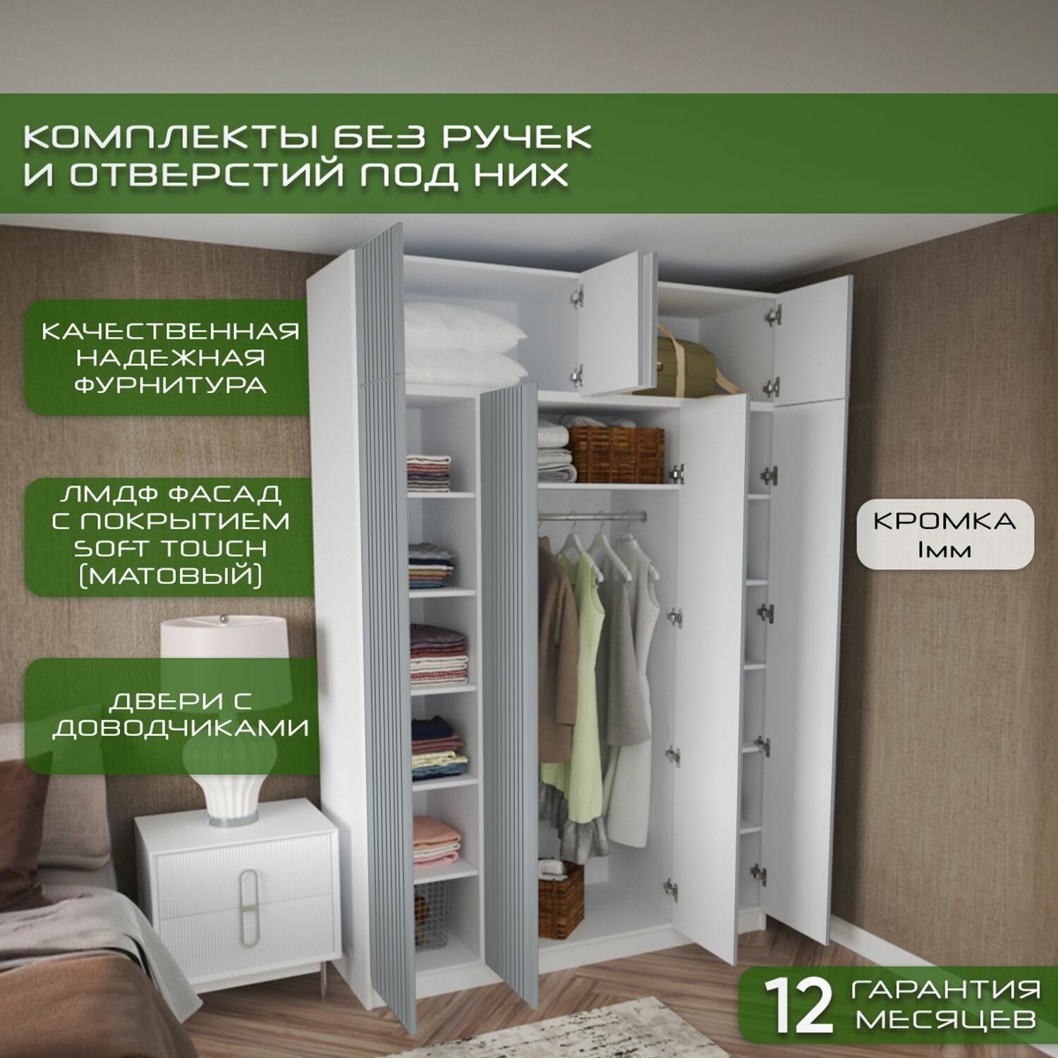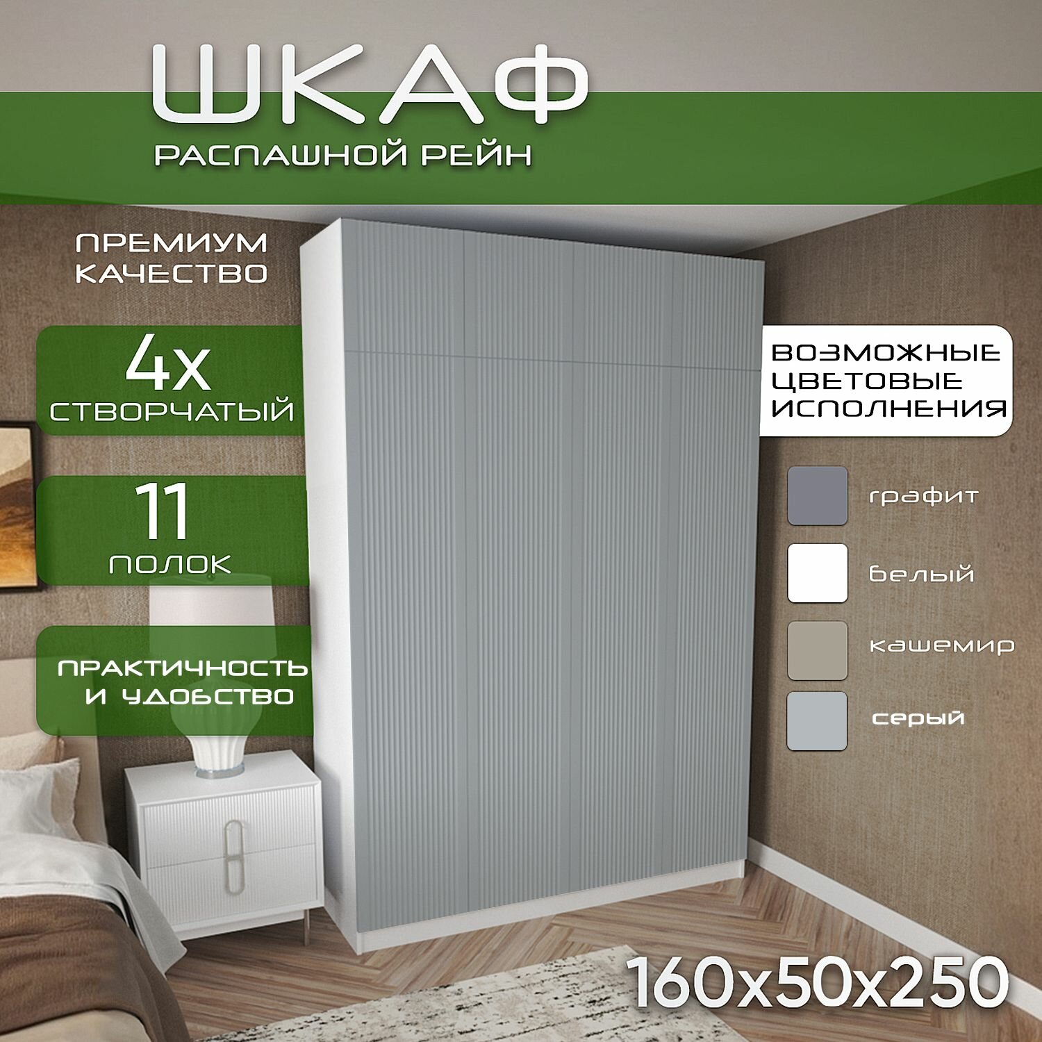 Шкаф для одежды распашной 160х50х250 Рейн, белый/ мдф серый soft touch матовый, 4х створчатый: сравнение цен, характеристики, фото, актуальное наличие и цены.