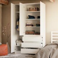 Конструкция шкафа включает в себя 3 съемные и 2 стационарные полки, 3 выдвижных ящика (шариковые направляющие), металлическую штангу для одежды и 3 распашные двери со скрытыми ручками. Внутреннее пространство белого шкафа можно использовать для хранения вещей одного типа или тематически по назначению. Например, верхние полки использовать под футболки и майки, нижние полки и ящики - под носки, перчатки и шарфы, пижамы и домашнюю одежду. Благодаря шариковым направляющим в комплекте, ящики шкафа будут плавно выдвигаться и тихо закрываться, они более надежны и долговечны.