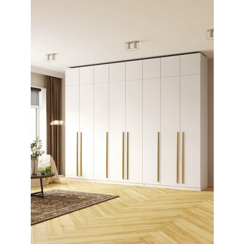 Представляем вашему вниманию просторный распашной шкаф для одежды, который станет идеальным решением для хранения вещей в вашем доме. Этот 8-ми дверный белый шкаф с золотыми ручками и с антресолью выполнен в современном дизайне и прекрасно впишется в любой интерьер — будь то спальня, гостиная, прихожая или детская.