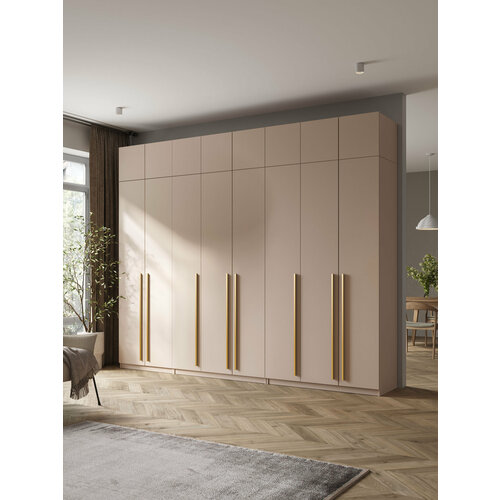 Шкаф для одежды в цвете кашемир с золотыми ручками - это идеальное решение для любого помещения, будь то прихожая, спальня или детская комната. Этот шкаф имеет 8-ми дверный с антресолью, что позволяет хранить большое количество вещей. Он изготовлен из ЛДСП и покрыт матовым ламинированным покрытием, что делает его долговечным и простым в уходе.