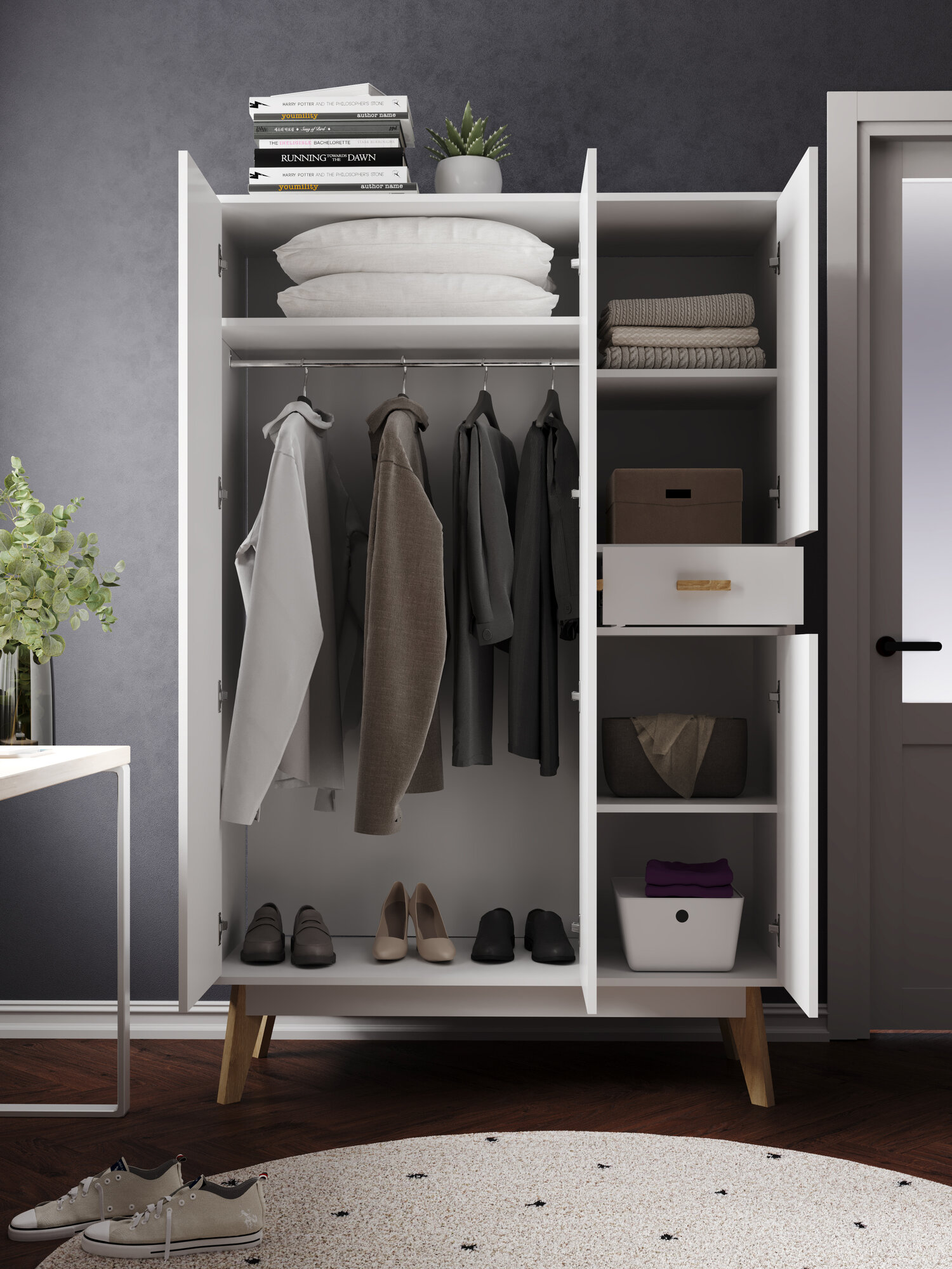 Этот шкаф также оснащен выдвижным ящиком, который предлагает дополнительное пространство для хранения мелочей или аксессуаров. Вы сможете легко найти все необходимое благодаря удобной организации внутреннего пространства.