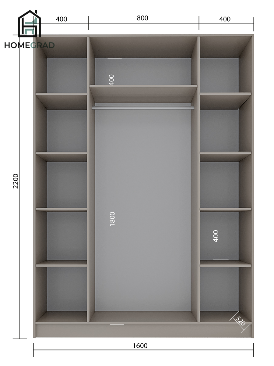 Модель изготовлена из прочной и долговечной ЛДСП, что гарантирует надежность и долгий срок службы. Габариты шкафа составляют 160 см в ширину, 220 см в высоту и 52 см в глубину, что позволяет разместить в нем большое количество вещей.