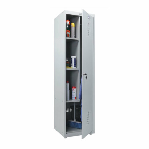 • ключевой замок «Практик» (2000 комбинаций) • вентиляционные отверстия • конструкция шкафов позволяет скреплять их между собой • возможность установки двери с правым или левым открыванием (по желанию заказчик изменяет направление открывания двери) • комплектация: вертикальная перегородка, 3 полки под хозяйственный инвентарь, держатель для швабры, крючки для одежды, перекладина для плечиков • в комплект поставки входят четыре регулируемые опоры (диапазон регулировки – 30 мм) • высота с установленными опорами – 1870 мм • поставляются в разобранном виде
