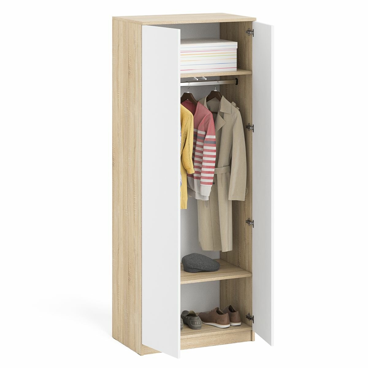 - Шкаф оборудован двумя распашными дверями. За дверями расположены горизонтальная штанга для одежды на плечиках, антресольная полка для головных уборов и нижняя ниша.