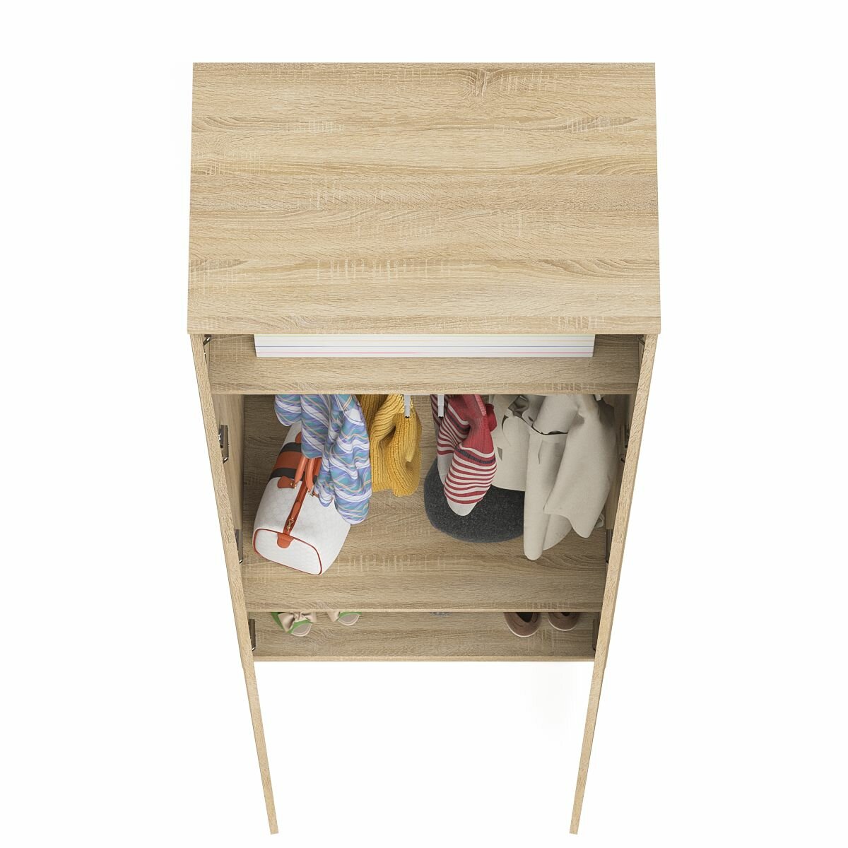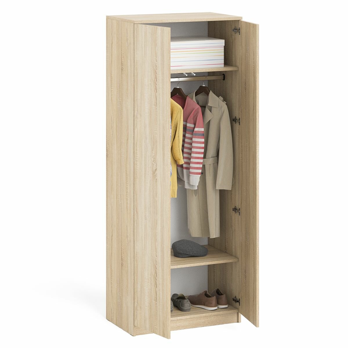 - Шкаф оборудован двумя распашными дверями. За дверями расположены горизонтальная штанга для одежды на плечиках, антресольная полка для головных уборов и нижняя ниша.