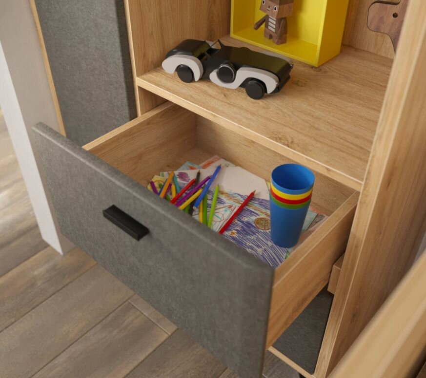 - Корпус: Щит верхний, нижний, стенки боковые - плита ДСП ламинированная, Е0,5. Цвет – Дуб Наварра. Материал для кромок деталей: ABS . Стенки средние, полки - плита ДСП ламинированная, Е0,5. Цвет – Дуб Наварра. Материал для кромок деталей: кромочный