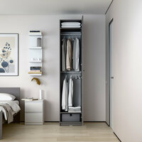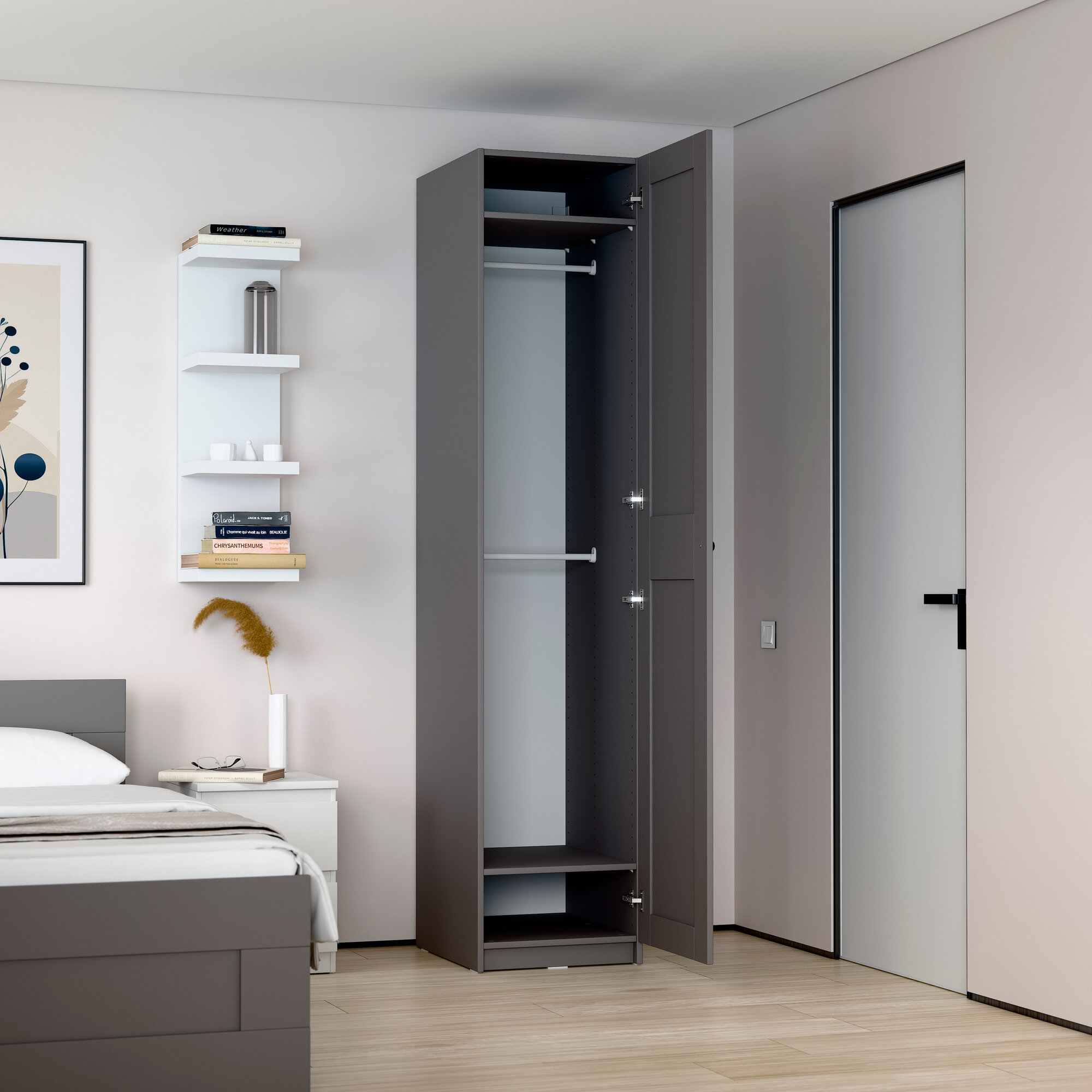 Комплект данного шкафа состоит из: Корпуса, двери, петель с доводчиками, 2 полок и 2 штанг. Система является модульной и при необходимости к ней можно докупить: Полки 50х58. Артикул маркета 103513640862 Выдвижные ящики 50х58. Артикул маркета 103513640772 Выдвижные брючницы 50х58. Артикул маркета 4370719109 Выдвижные полки 50х58. Артикул маркета 4370723071