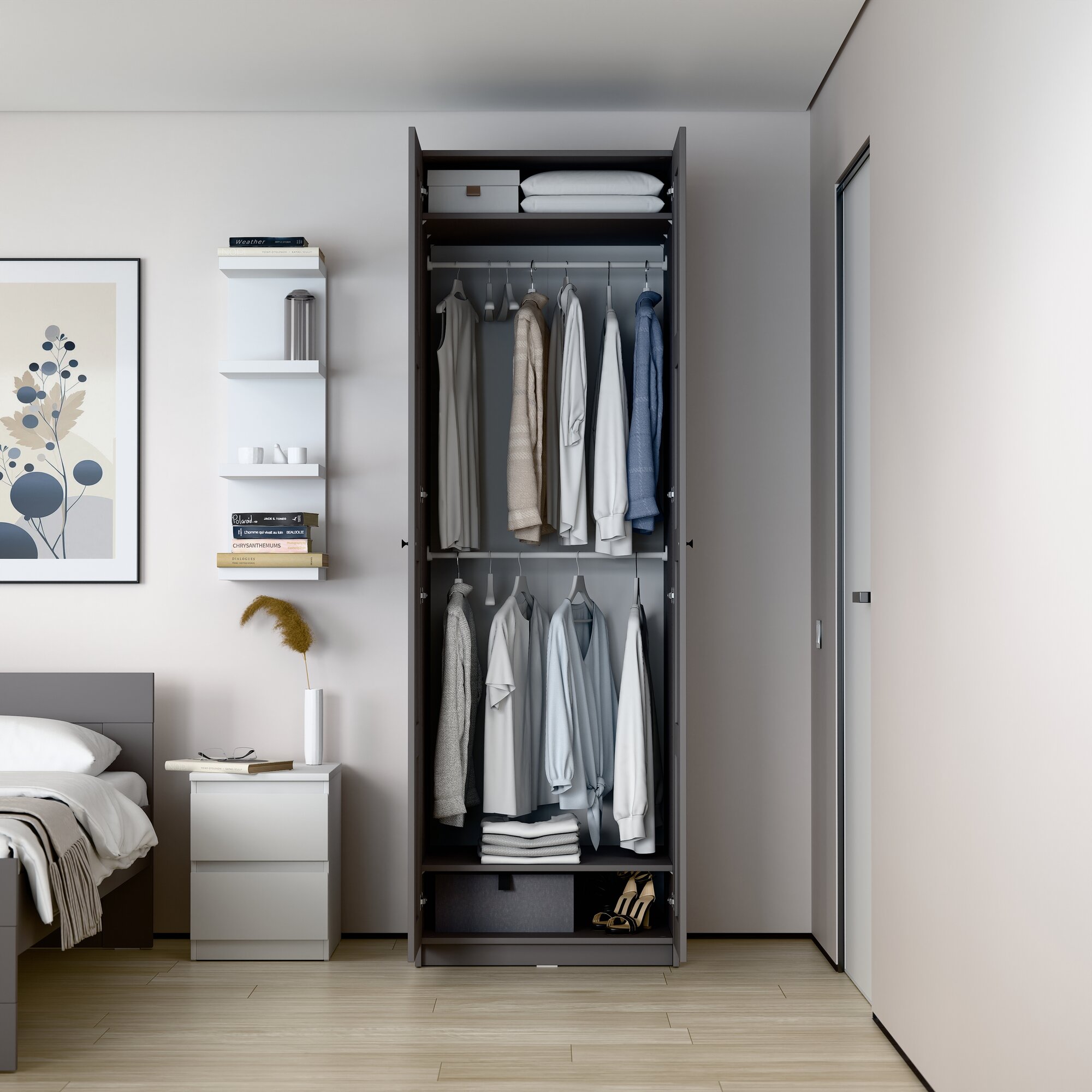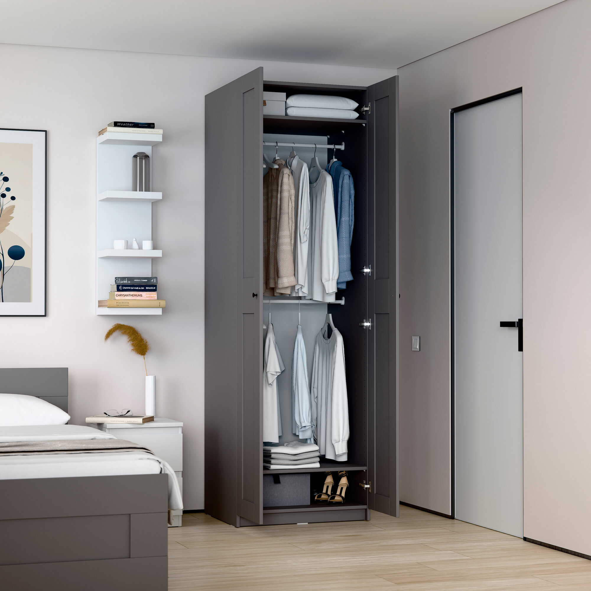 Гардероб макс можно дополнить различными аксессуарами для максимально эффективной организации внутреннего пространства: выдвижными ящиками, полками, разделителями, и другими элементами. В базовой комплектации шкаф уже оснащен прочной платяной штангой и двумя полками, что позволяет сразу приступить к организации хранения и упорядочиванию вещей.